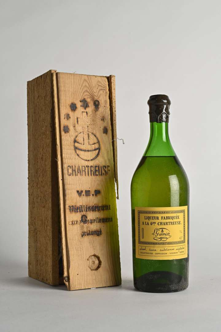 1 B CHARTREUSE JAUNE V.E.P. 100 cl 42% "mise dans nos foudres de chêne en l'an 1968"(Caisse Bois d'origine abimée) (5,5 cm| e.l.a| n° 8440| contre-étiquette très abimée) - NM - Pères Chartreux