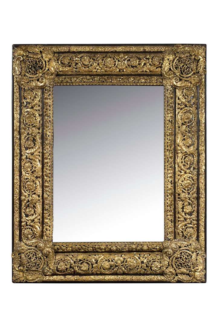 GRAND MIROIR «aux mavelots» rectangulaire à âme de bois noirci, le cadre à ressaut à très riches applications de cuivre doré repoussé présentant des mavelots à chacun des angles.