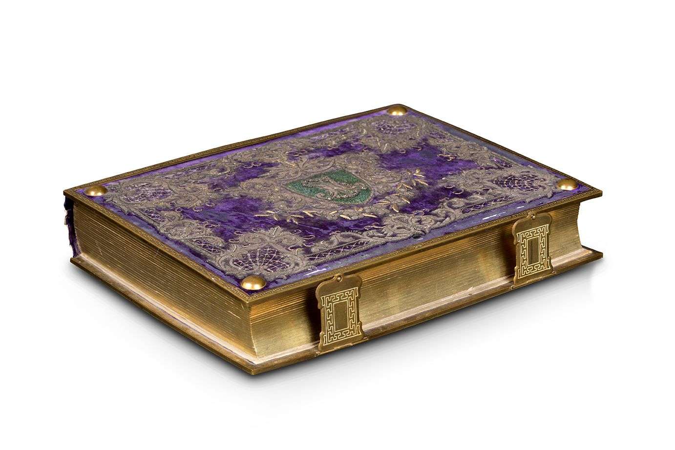 ALBUM DE PHOTOGRAPHIES sous forme d'un gros ouvrage pour recevoir les photographies anciennes, importante reliure garnie de velours violet brodée de fils d'argent.