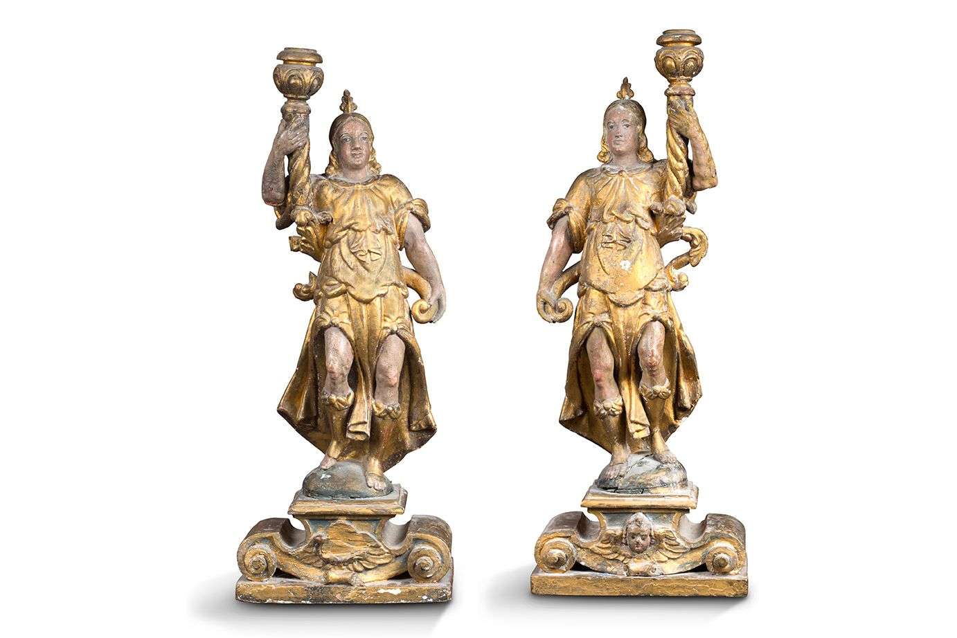 DEUX PERSONNAGES céroféraires en pendants, bois sculpté et doré, se tienne
