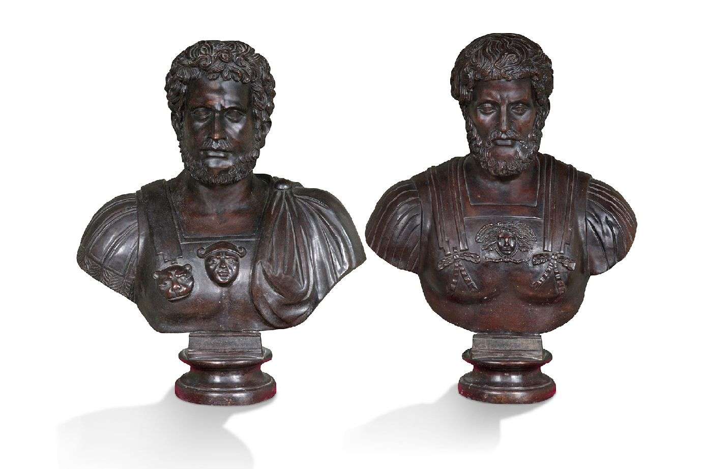 DEUX IMPORTANTS BUSTES d'empereurs ou généraux de l'Empire Romain représentant probablement Hadrien et Lucius Verus. Décor de masques, mufles et méduses sur la cuirasse.
