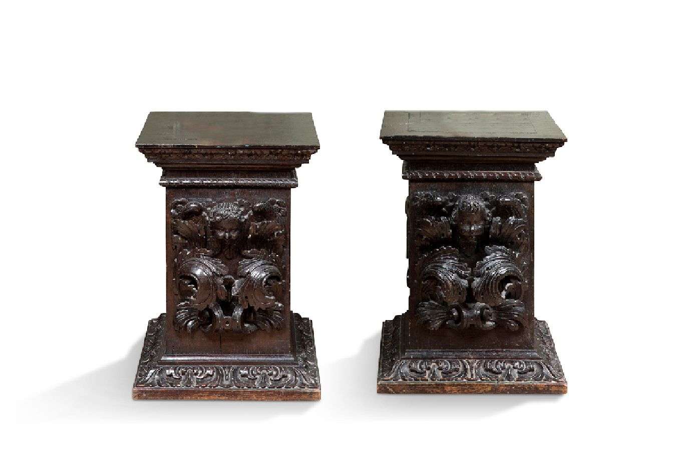 PAIRE DE SELLETTES en chevets rectangulaires de bois richement sculpté et noirci de mascarons et volutes feuillagés.