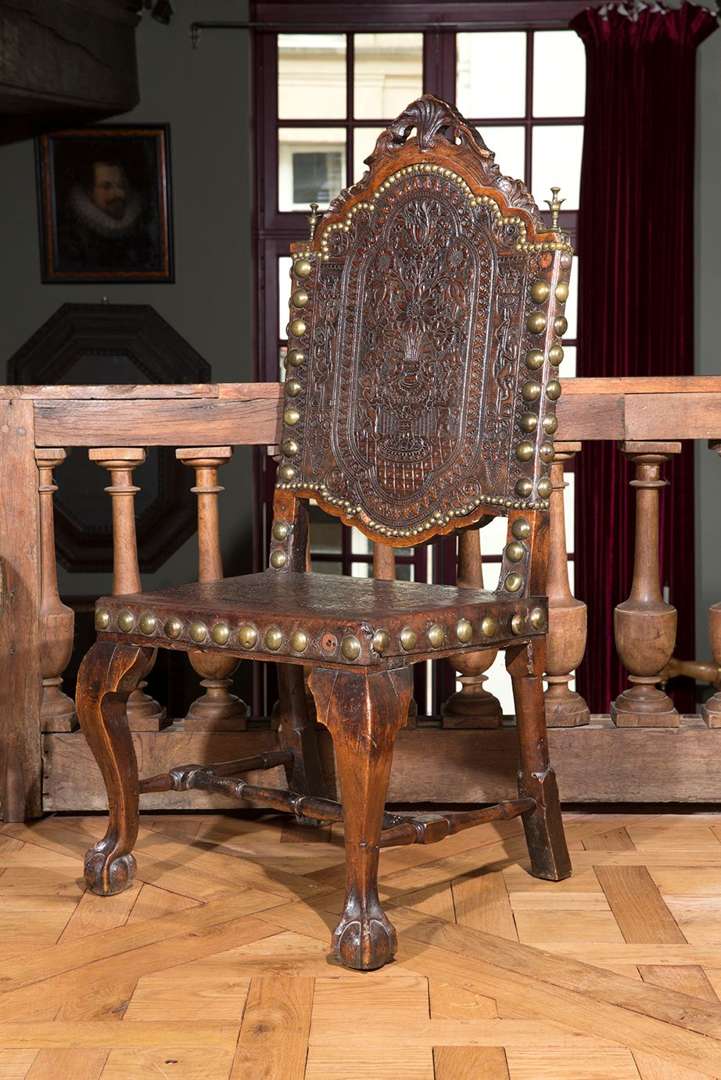L'assise et le dossier garnis de cuir gauffré. Les pieds antérieurs caractéristiques en pattes de lions.