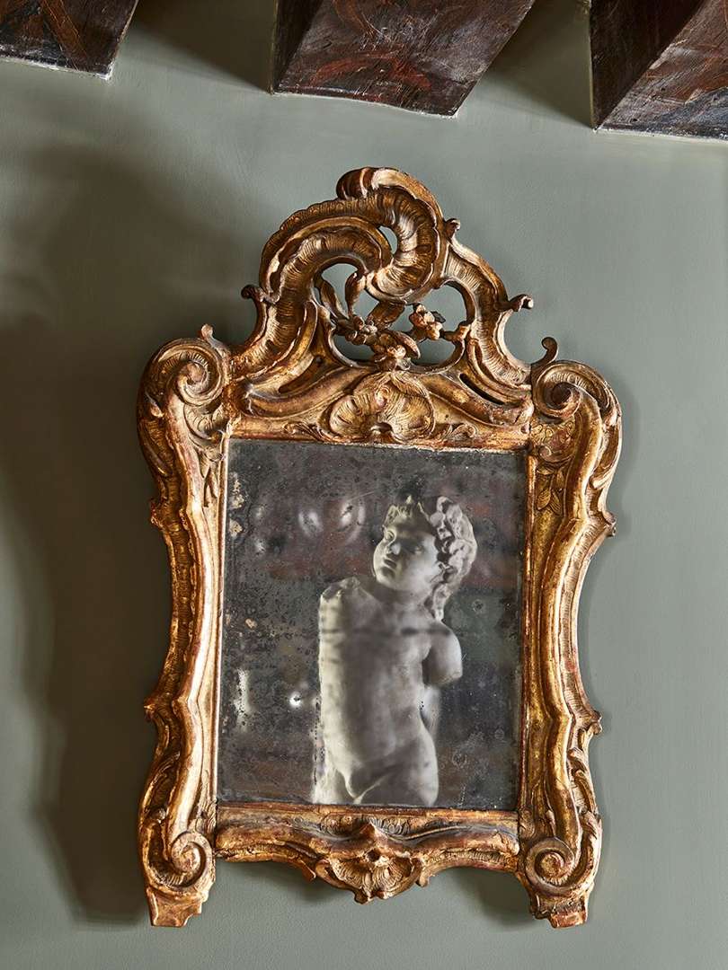 PETIT MIROIR en bois doré sculpté à décor de rocailles.