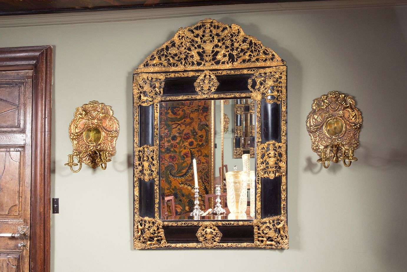 La platine à décor de putti tenant une corbeille et de guirlandes et rinceaux feuillagés.