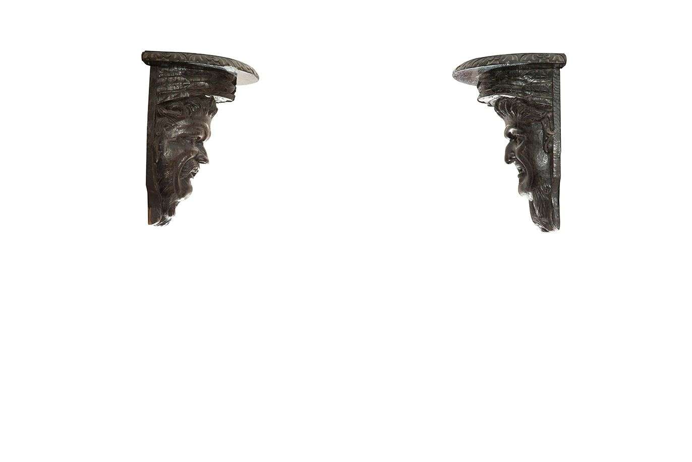 DEUX CONSOLES «grotesques» d'appliques murales, le culot sculpté en forme de masques grotesques.