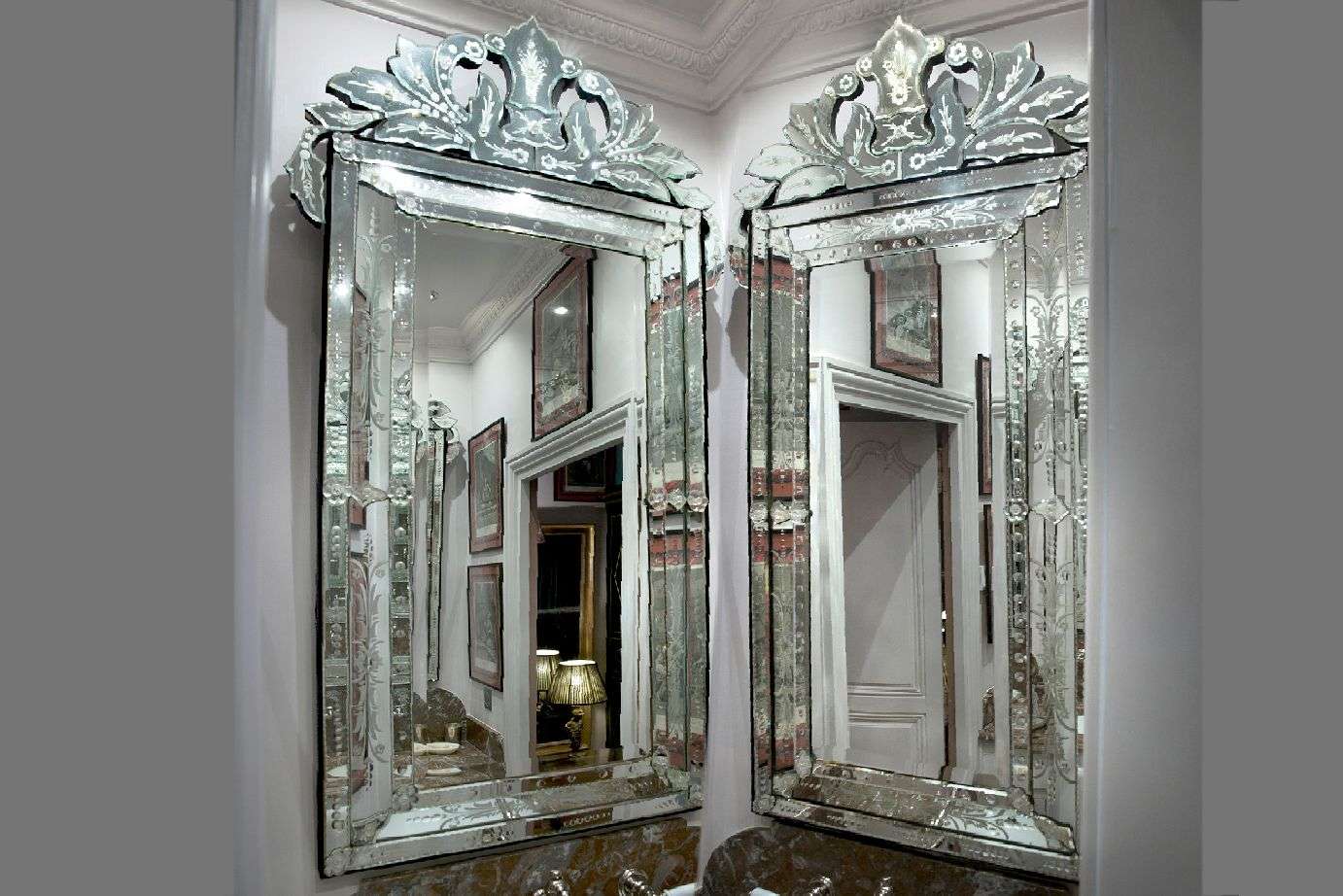 PAIRE DE MIROIRS VÉNITIENS en verre de forme rectangulaire surmontés de frontons. Décor gravé de motifs floraux stylisés.