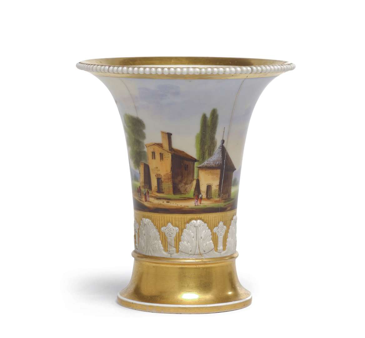 VASE cornet en porcelaine blanche et décor peint polychrome d'un paysage animé. Rehauts d'or.