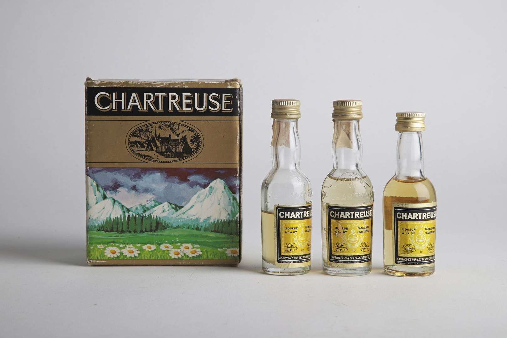COFFRET D'ORIGINE de 3 MIGNONETTES DE CHARTREUSE JAUNE TARRAGONE PÉRIODE 1