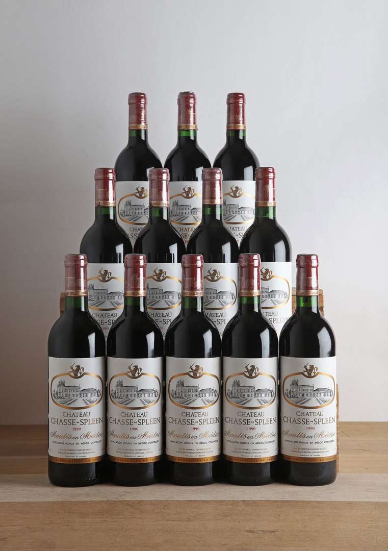 12 B CHÂTEAU CHASSE-SPLEEN (Caisse Bois d'origine) (10 e.l.s| 1 e.t.h| 1 e.t.a| 9 c.a. bas de jupes par guillotines) - 1990 - Moulis
