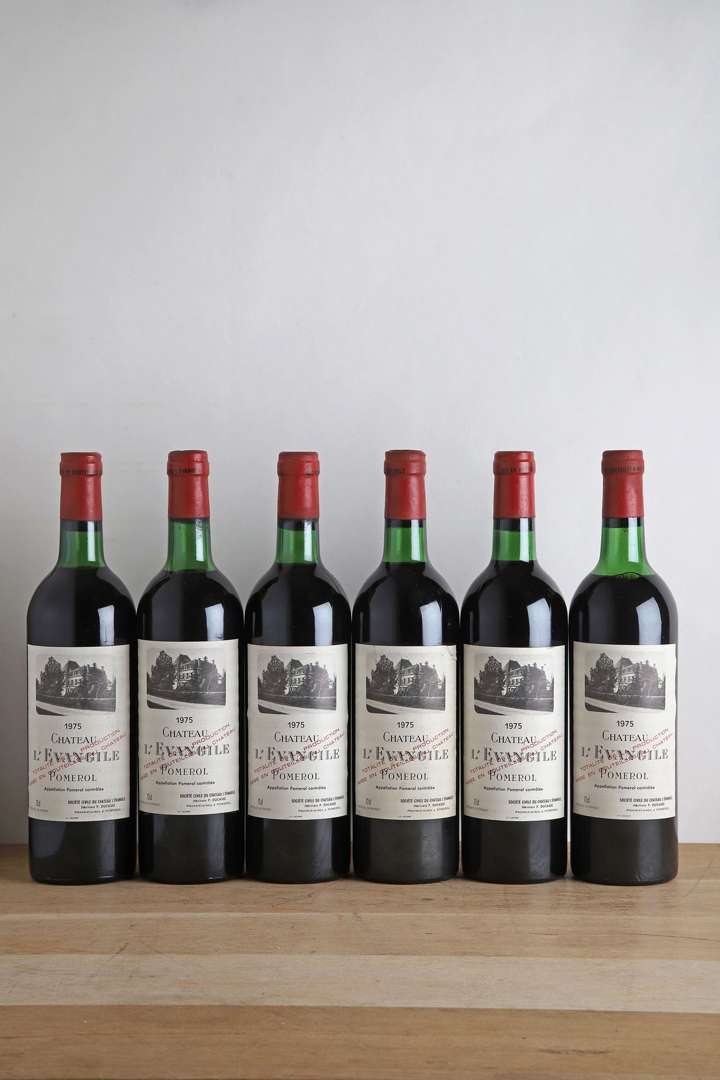 6 B CHATEAU L'ÉVANGILE (1 B.G| 2 T.L.B.+| 1 T.L.B| 1 T.L.B.- et 1 H.E.+| 2 e.l.s| 3 e.t.h. légères dont 1 e.a| 1 e.l.a| 2 capsules plissées dont 1 avec 1 accroc bas de jupe) - 1975 - Pomerol