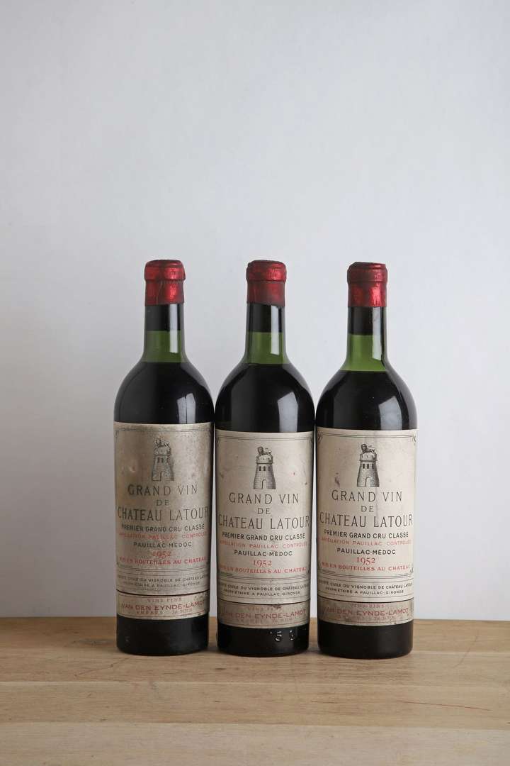 3 B CHÂTEAU LATOUR (2 T.L.B.-| 1 H.E.+| e.t.h| bandeaux négoce Van den Eynde - Labot à Anvers| c.s| bouchons et capsules estampés) - 1952 - GCC1 Pauillac