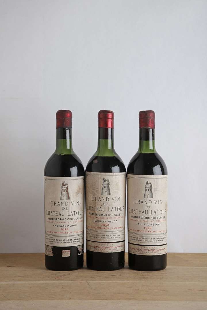 3 B CHÂTEAU LATOUR (1 T.L.B.-| 2 H.E.+| e.t.h| bandeaux négoce Van den Eynde - Labot à Anvers dont 1 abimé| c.s| bouchons et capsules estampés) - 1952 - GCC1 Pauillac