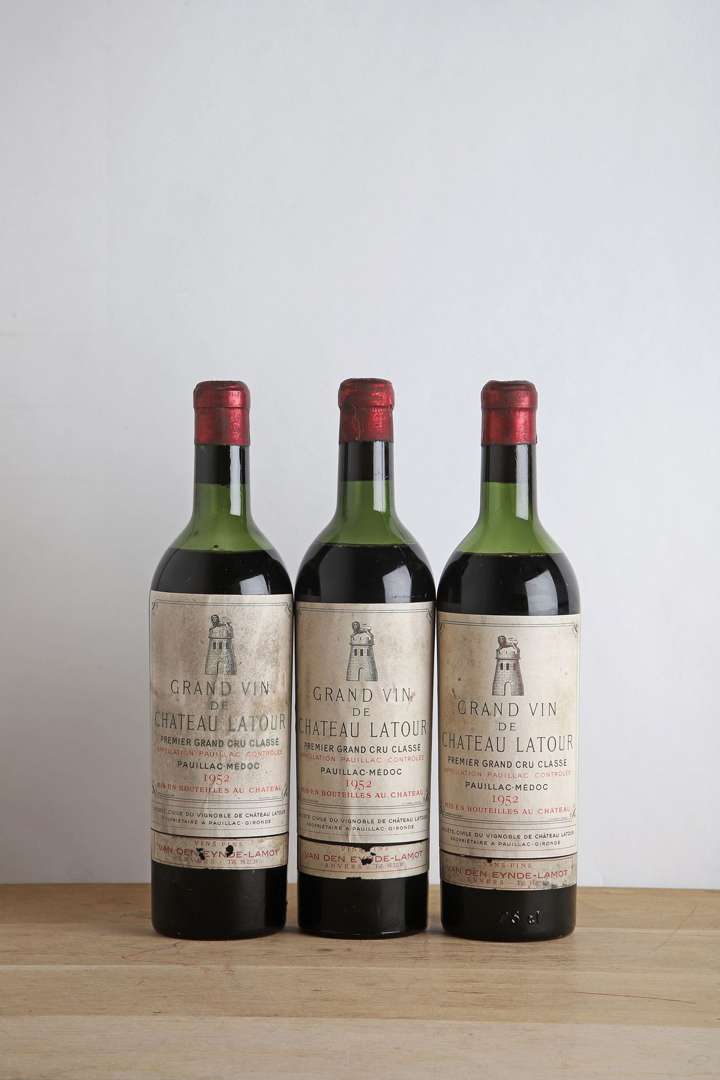 3 B CHÂTEAU LATOUR (1 H.E| 2 M.E.+| e.t.h| bandeaux négoce Van den Eynde - Labot à Anvers abimés| c.s| bouchons et capsules estampés) - 1952 - GCC1 Pauillac