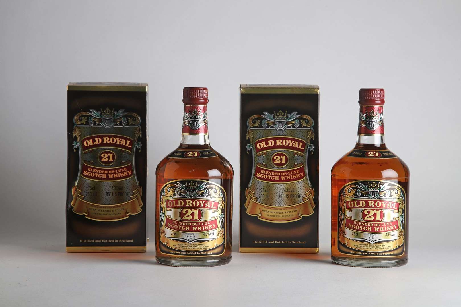 2 B BLENDED DE LUXE SCOTCH WHISKY OLD ROYAL 21 ANS D'ÂGE 75 cl 43% (étuis d'origine) - NM - Burn Mackenzie & Co
