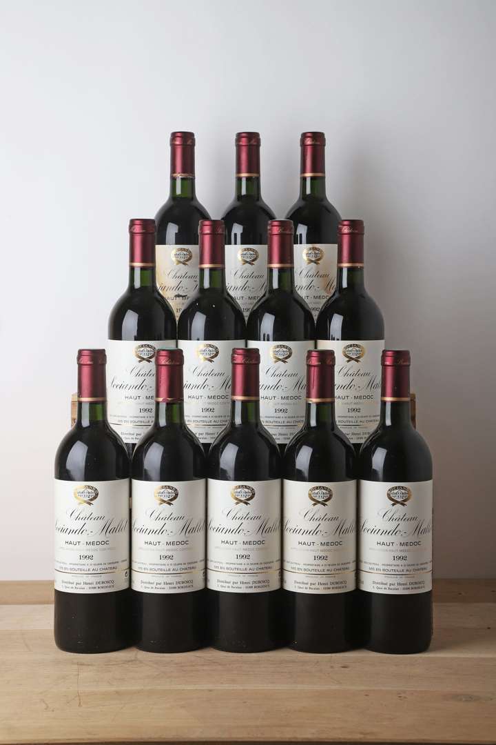 12 B CHÂTEAU SOCIANDO-MALLET (B.G| e.l.s. à e.t.h. dont 1 e.a| 1 c.l.a. bas de jupe) - 1992 - Haut-Médoc