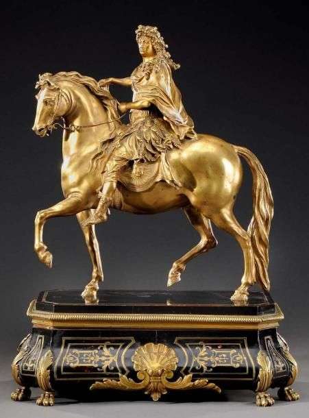 Statuette en bronze ciselé et doré, figurant Louis XIV à cheval, d'après Coysevox. Il repose sur une base à légère doucine, en placage d'écaille brune et de cuivre, rehaussé de bronze ciselé et doré, à coquilles, rinceaux à feuilles d'acanthe et feuillages. Petits pieds griffes. XIXe siècle H: 59 - L: 44 - P: 28 cm