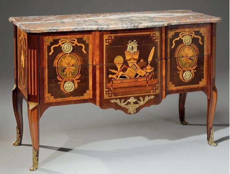 Commode à double ressaut en placage de bois indigène marqueté dans des encadrements à filets de sycomore et de buis. Elle présente en plein les attributs de la science reposant sur un bureau plat stylisé| sur les côtés des médaillons ou cartouches ovales à attributs agrestes ou de la Paix. Montants à pans coupés à triples cannelures| pieds cambrés Estampilles de Bircklé Transition des époques Louis XV et Louis XVI (restaurations notamment à la marqueterie) Plateau de marbre brèche rouge, rosé et gris. H: 84,5 - L: 129 - P: 57,5cm