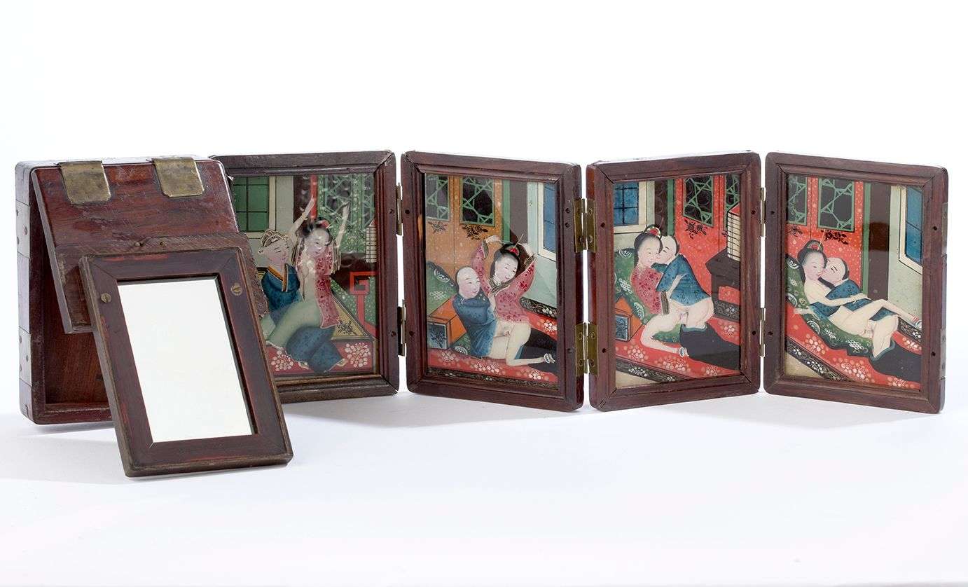 Petit coffret de bois dépliant à charnières et révélant huits fixés sous verre aux scènes érotiques. Le couvercle dévoilant un miroir.