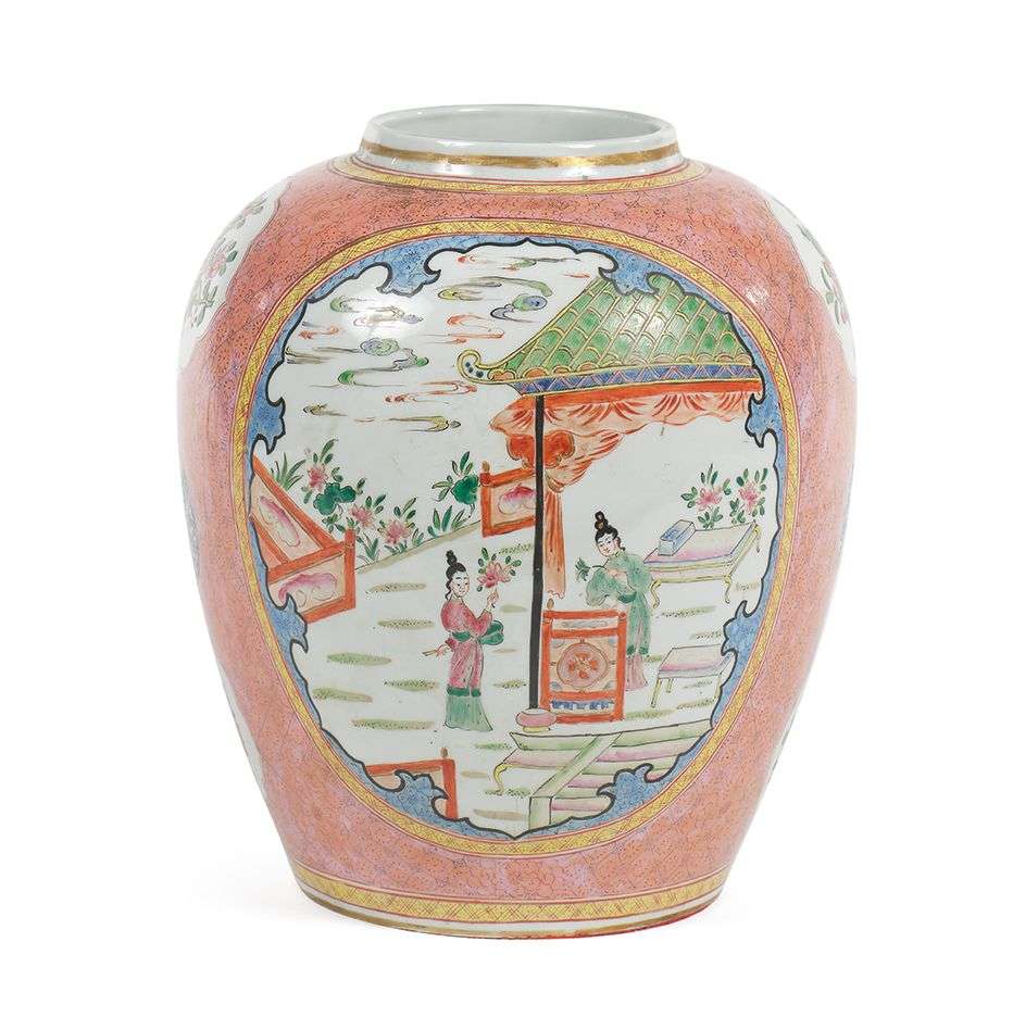 Vase en porcelaine monté en lampe, à décor émaillé dans le style de la famille rose de scènes animées dans des réserves.~