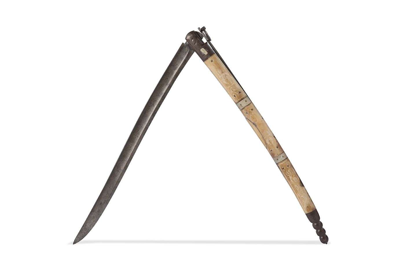 Le manche orné de plaques en os à décor de personnage et de rinceaux.