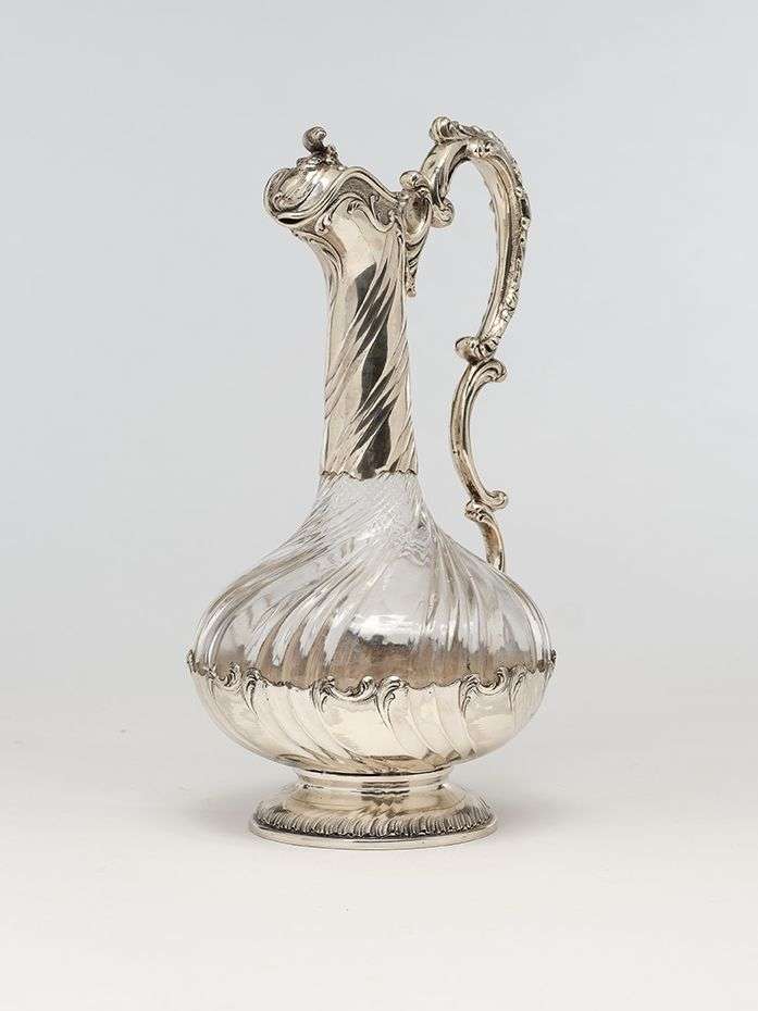 La panse en verre torsadé et monture en argent. Le piédouche à motifs de vagues, l'anse à enroulement, le couvercle à charnière surmonté d'une prise en forme de rinceau.