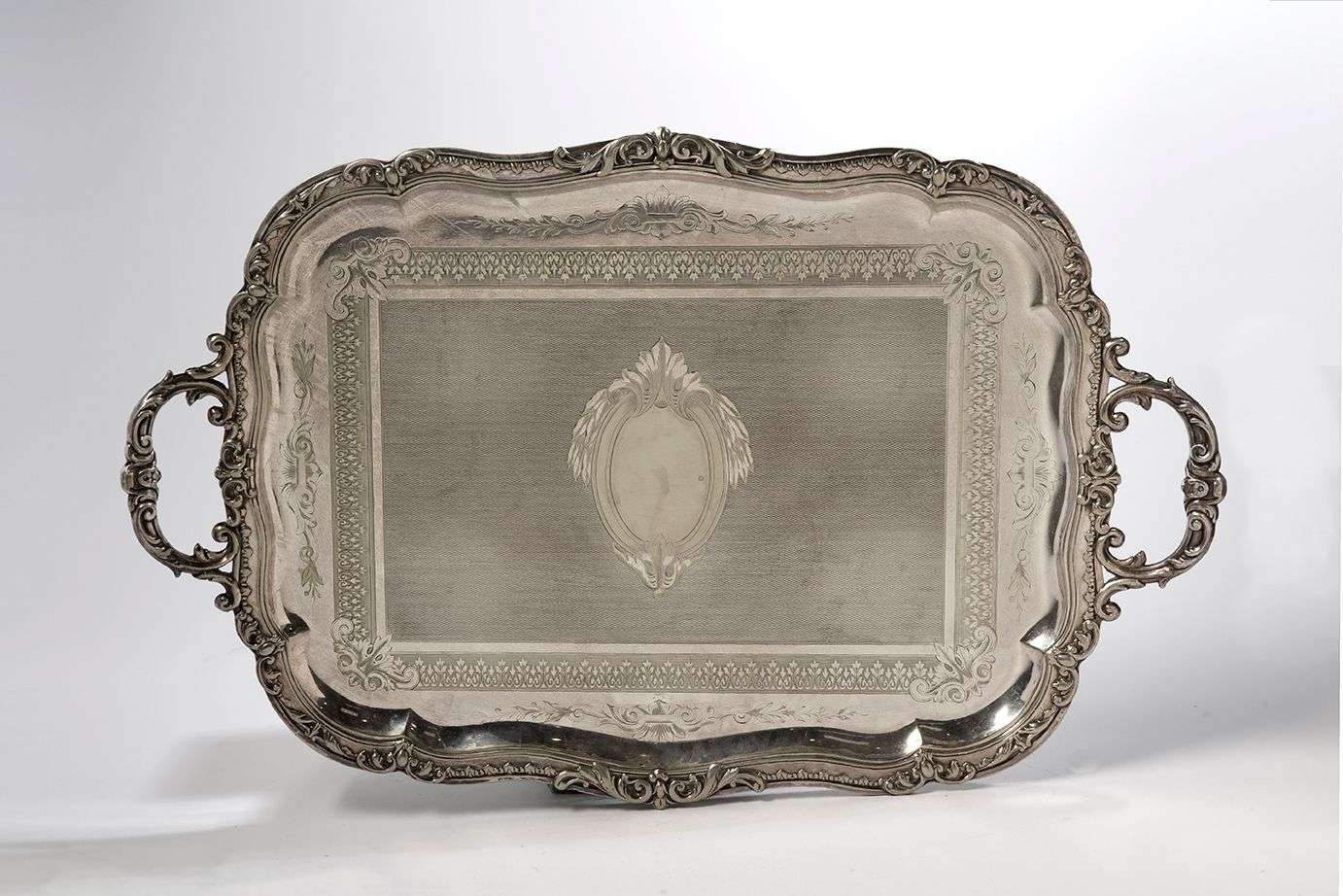 en métal argenté à décor de frises et de rinceaux feuillagés.