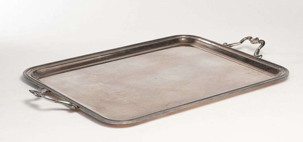 Grand plateau en métal argenté. Les anses ornées de coquilles. ~