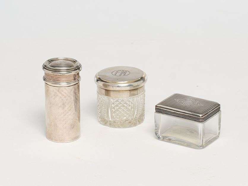 - une petite boîte rectangulaire à panse en verre et le couvercle en métal argenté présentant un cartouche à décor de rocaille en son centre.~