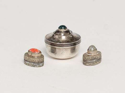 en métal argenté à décor de boutons de cabochons.~