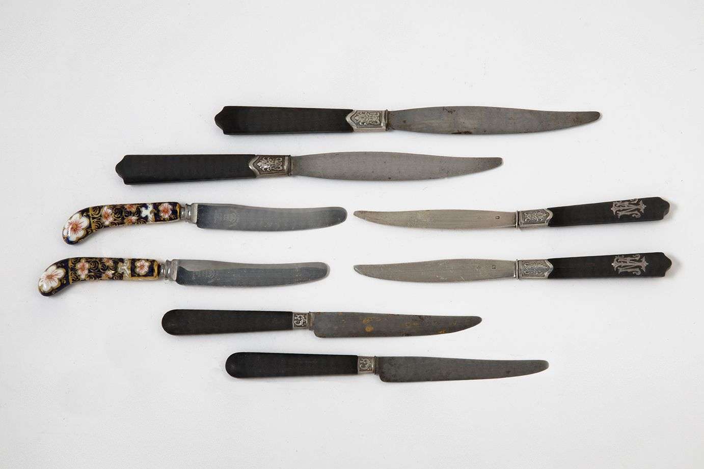 Puis 15 couteaux à entremets aux manches de porcelaine à décor imari.
