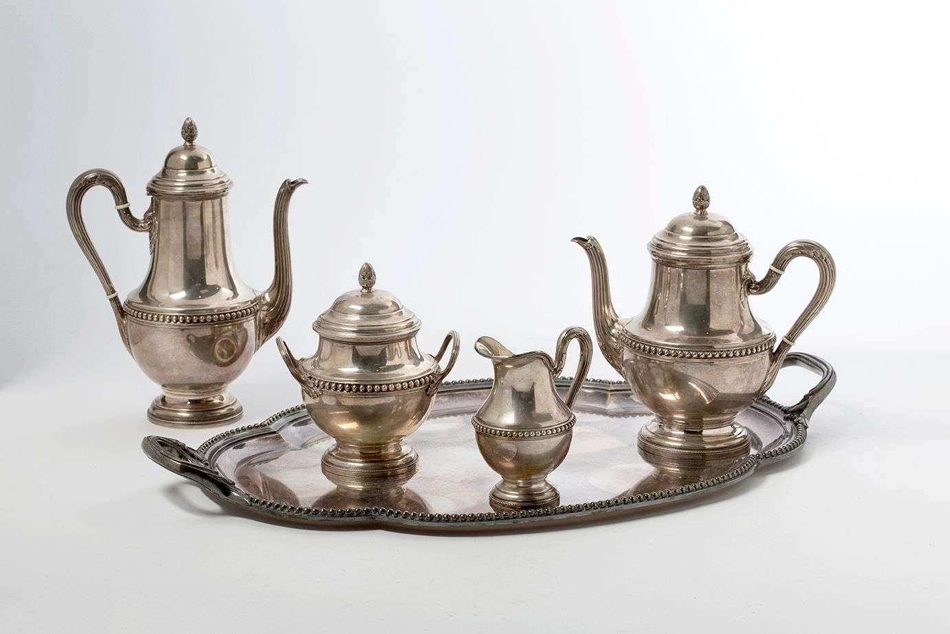 Service à thé et à café en argent composé d'une théière, d'une cafetière, d'un sucrier et d'un pot à lait.