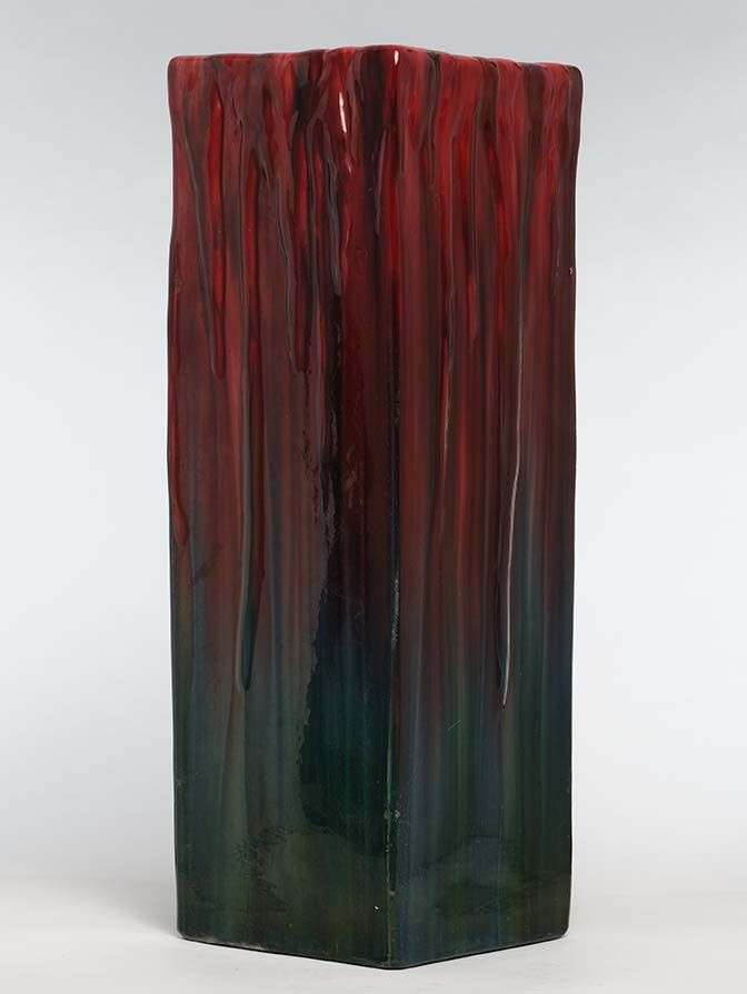 en céramique émaillée pourpre et verte, à décor de coulures.~
