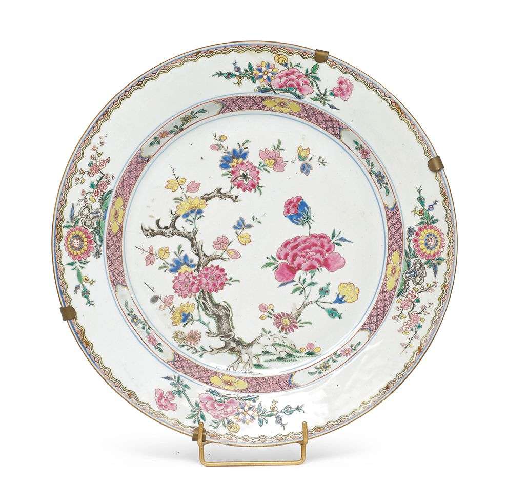 de forme circulaire en porcelaine à décor émaillé dans le style de la famille rose d'un arbre fleuri.