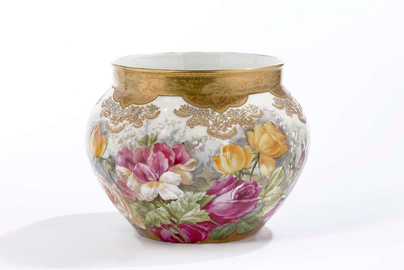 Cache-pot en porcelaine à décor émaillé et polychrome de bouquets fleuris. Le col doré.