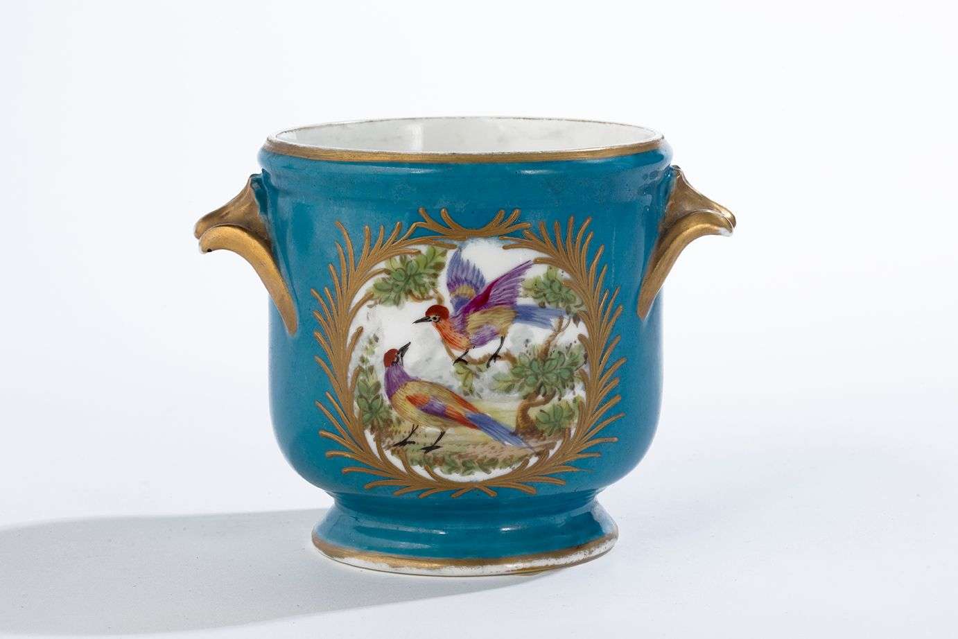 en porcelaine émaillée bleue. la panse à décor de fleurs et oiseaux insérés dans des réserves.