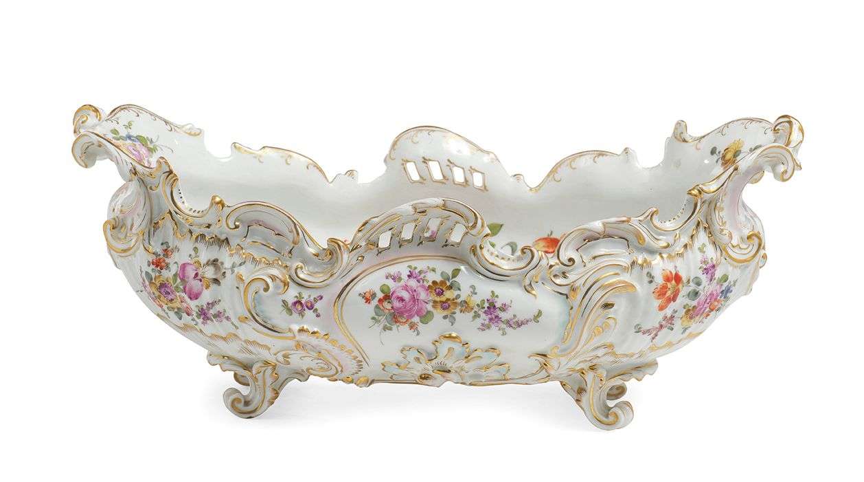 formant centre de table en porcelaine peinte, émaillée et ajourée à décor de fleurs reposant sur quatre pieds. Marque aux épées croisées couronnées.~