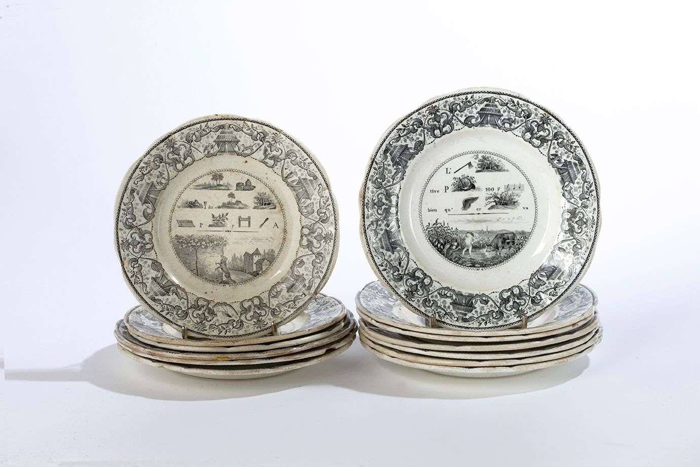 Suite de 13 assiettes circulaires en faïence à décor imprimé en grisaille de scènes sur le thème des rébus.