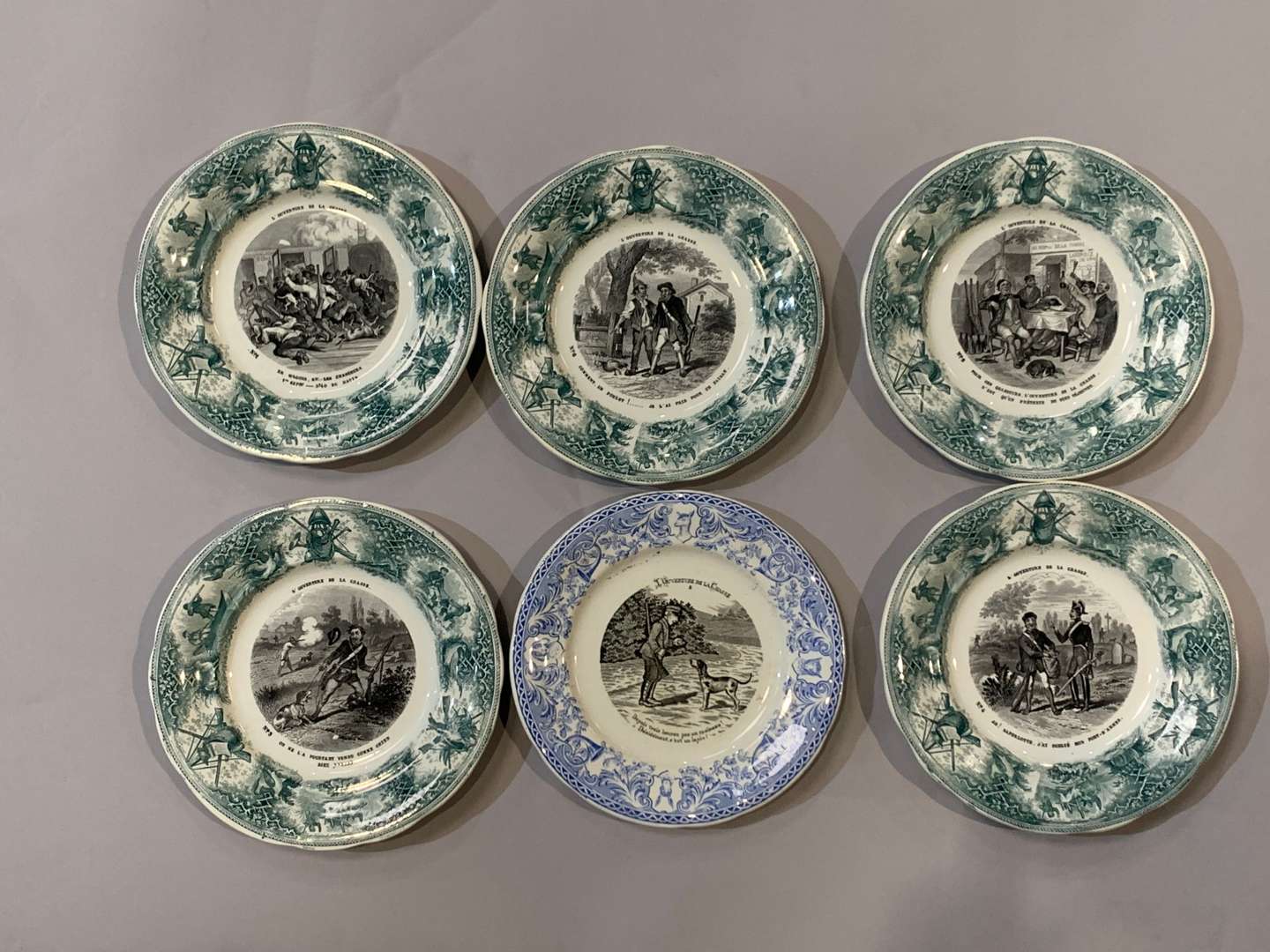 Suite de 5 assiettes circulaires en faïence à décor imprimé vert et grisaille de scènes sur le thème de l'ouverture de la chasse.