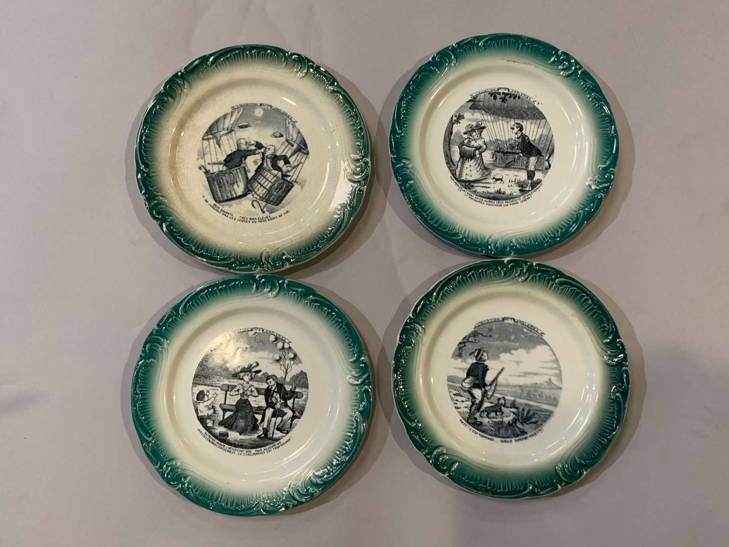 Suite de 4 assiettes circulaires en faïence à décor imprimé vert et en grisaille de scènes sur l'aviation et droleries.