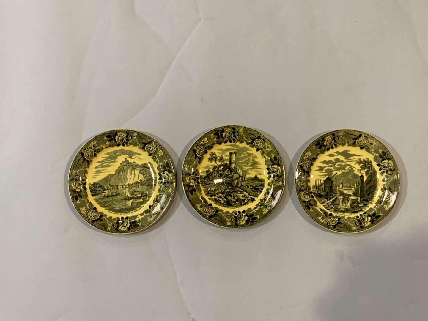 Suite de 3 assiettes circulaires en faïence jaune à décor imprimé de scènes sur le thème de l'Allemagne.