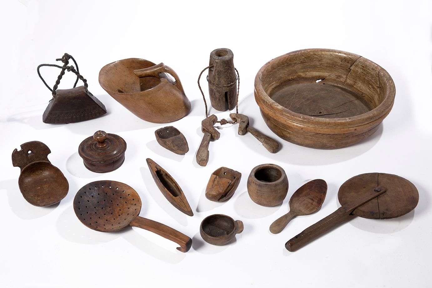 en bois dont une banette, un beurrier, des cloches à bétails, une navette, un écumoire, une roulette de charron, un sceau à traire et des pelles à grains.