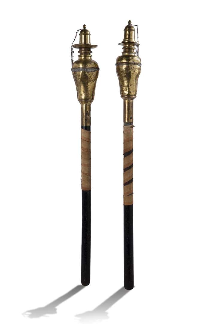 pansues en cuivre doré, binets à mèches de tissus visés sur réservoir à combustible. Bouchon à chaînette. Hampes rapportées en bois peint en noir.