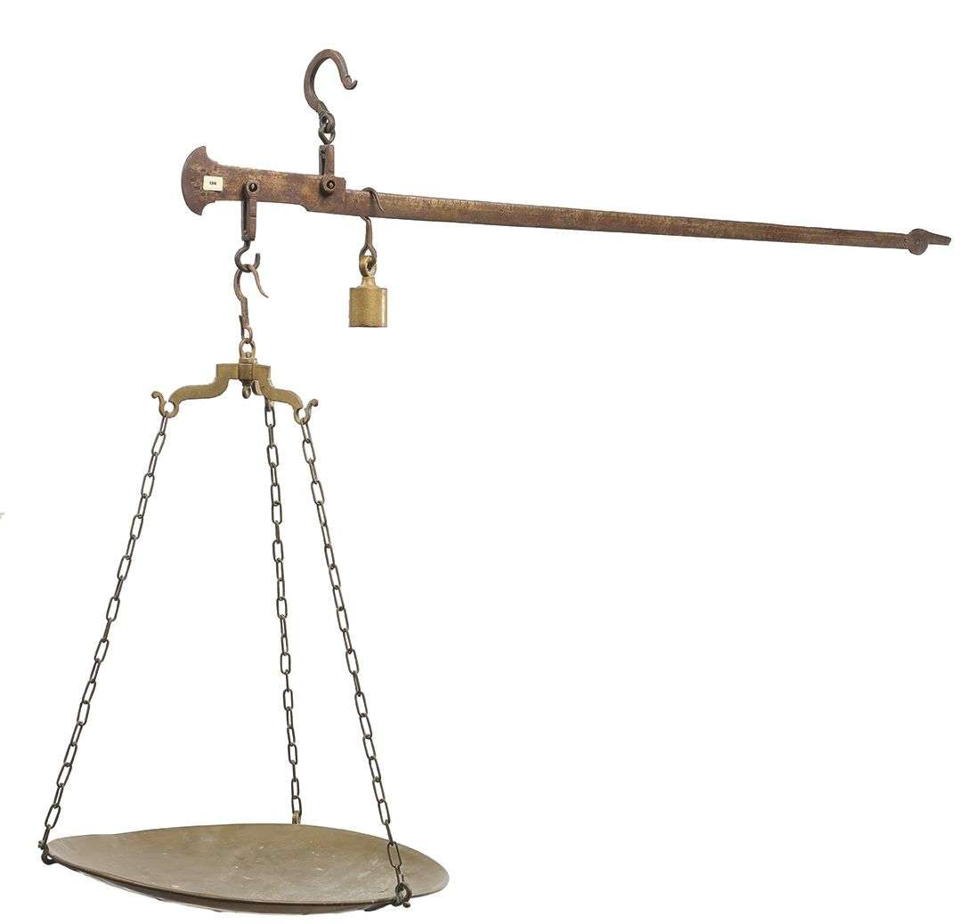 Le fléau en fer forgé. Munie d'un poids en bronze et d'un plateau en alliage cuivreux.