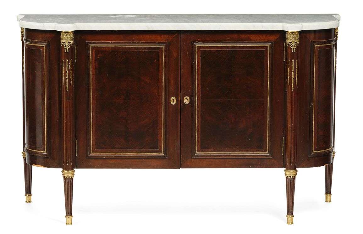 en bois de placage ouvrant par deux vantaux en façade découvrant deux étagères. Les montants arrondis et cannelés se terminent par des pieds fuselés.~