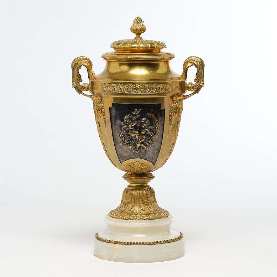 en bronze doré et ciselé. La panse ornée de chaque côté d'un cartouche en bronze à patine brune aux putti et flanquée de deux anses feuillagées.~