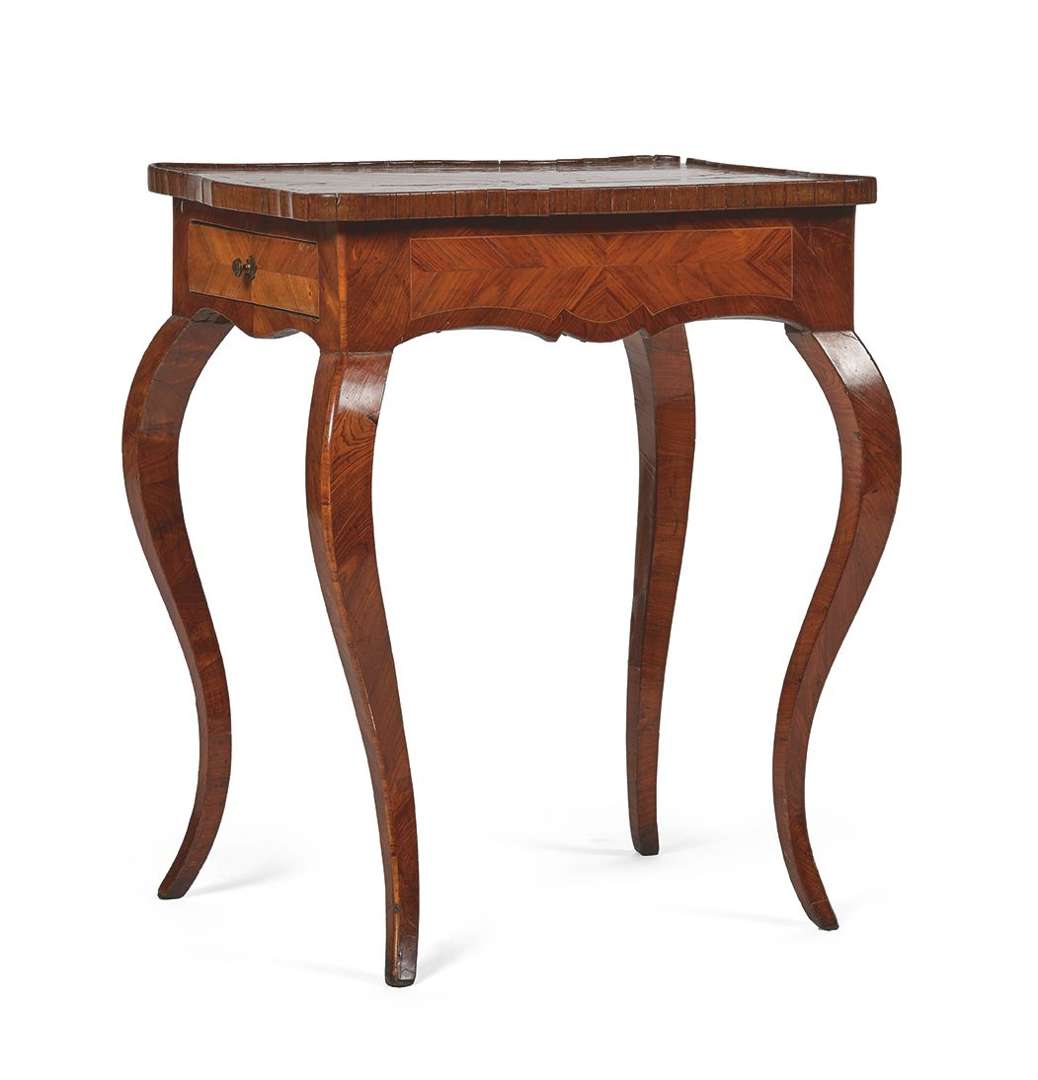 volante en marqueterie, reposant sur quatre pieds cambrés. La ceinture ouvre par un tiroir latéral.~