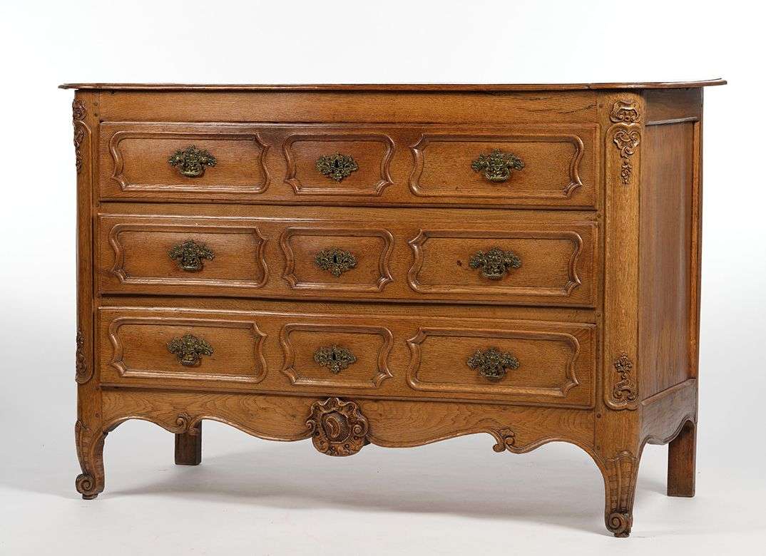 en chêne mouluré et sculpté à décor de rocaille. La façade ouvrant par trois tiroirs.~