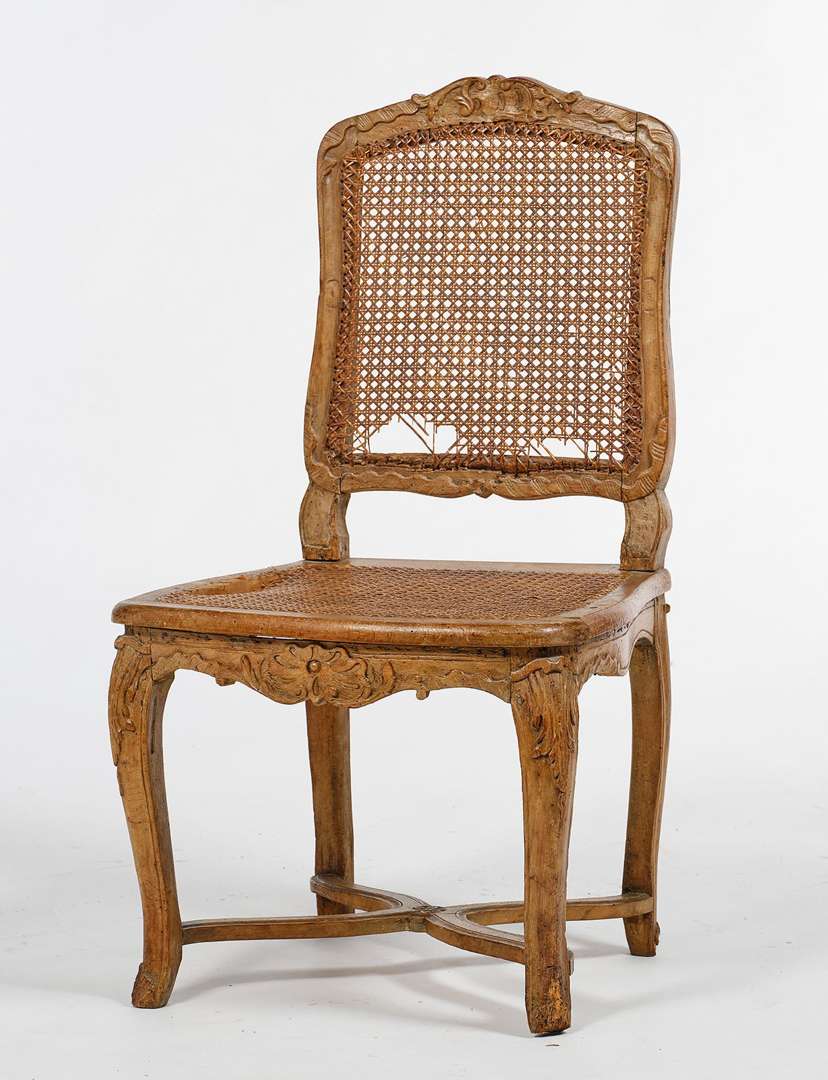 en bois au naturel mouluré et sculpté de coquilles et feuillages. Le dossier et la ceinture mouvementés. Repose sur quatre pieds cambrés reliés par une entretoise en X.
