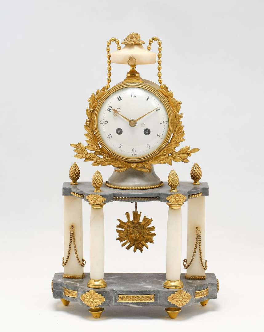 Le cadran émaillé blanc indiquant les heures et les quarts de minutes en chiffres arabes.